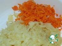 Отварную морковь почистить натереть на крупной терке, отправить к картофелю. |