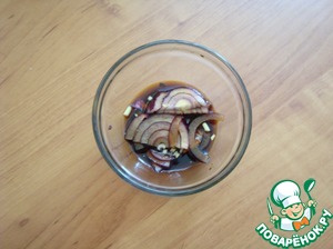 Сверху выкладываем по несколько полуколец замаринованного лука в соевом соусе. Горечь вышла, лук стал очень вкусный.