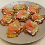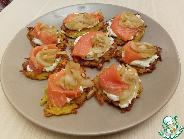Очень симпатичная и вкусная закуска на драниках, с творожным кремом и форелью, с маринованным, крымским луком в соевом соусе KIKKOMAN (натурально сваренный).
