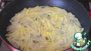 В сковороду добавить растительное масло. Обжарить картофель во фритюре не большими порциями.
