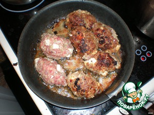 Почистить репчатый лук, обжарить на растительном масле. Часть выложить в фарш, часть оставить на сковороде.