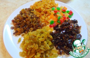 Приготовьте цукаты, изюм и порежьте финики маленькими кусочками