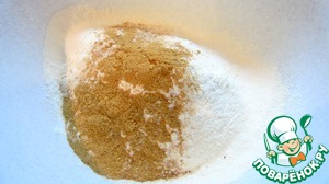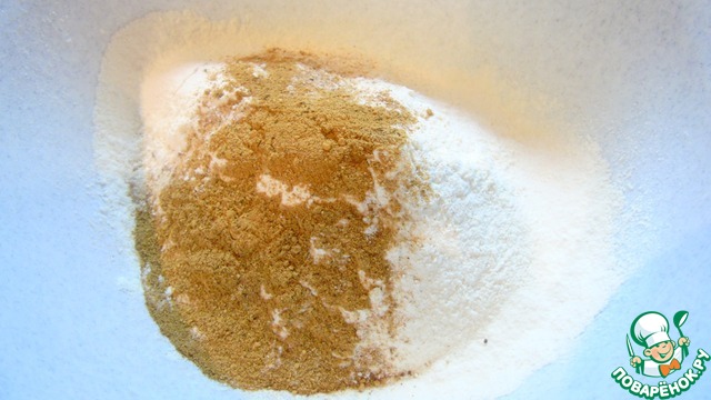 Муку просейте, добавьте приправы и разрыхлитель. Перемешайте.