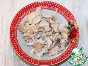 1. Филе грудки отварите в подсоленной воде с добавлением перца горошком и лаврового листа. Затем остудите.