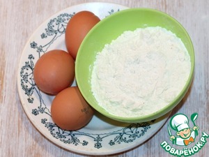 7. Замесите тесто из оставшейся муки, кефира, яиц и щепотки соли. Испеките на большой сковороде (Ф24-26 см) 2 блина.