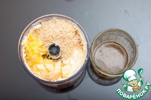 Добавить мед, цедру и миндальную крошку. Отложенные 25 мл коньяка подогреть в микроволновке и распустить в нем желатин, влить его в блендер, взбить в последний раз до однородной массы.