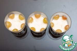 В стаканчики на дно положить немного сырно-виноградной массы, установить по стеночке виноградинки, срезом к стеклу и заполнить их доверху. Накрыть пленкой, убрать в холодильник. Перед подачей украсить оставшимся виноградом, миндалем и цедрой. У меня получилось 4 стаканчика по 150 мл, но лучше взять посуду меньшего объема - по 50-60 мл.