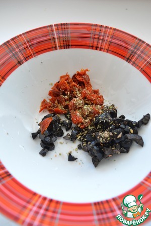 Мелко нарежьте маслины и вяленые томаты, добавьте итальянские травы