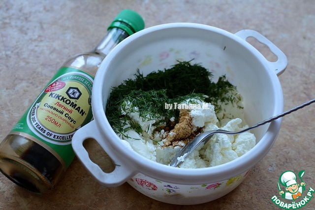 Творог смешать с мелко-рубленным укропом и соевым соусом;