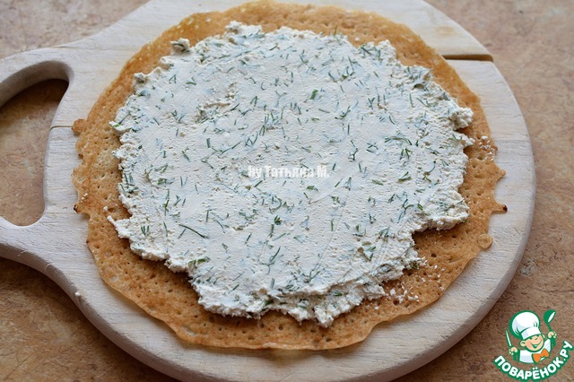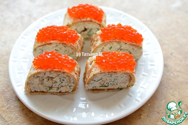 Рецепт «Блинные рулетики с творогом и икрой»: