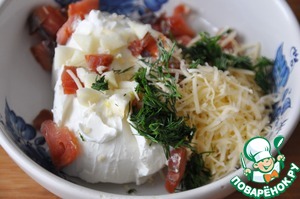 В миску кладём творожный сыр, мелко рубленные чеснок и укроп, мелко нарезанный лосось холодного копчения. У меня кета. Кладём половину натёртого сыра "Российский" Белебеевский.