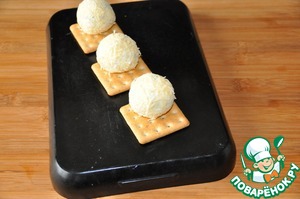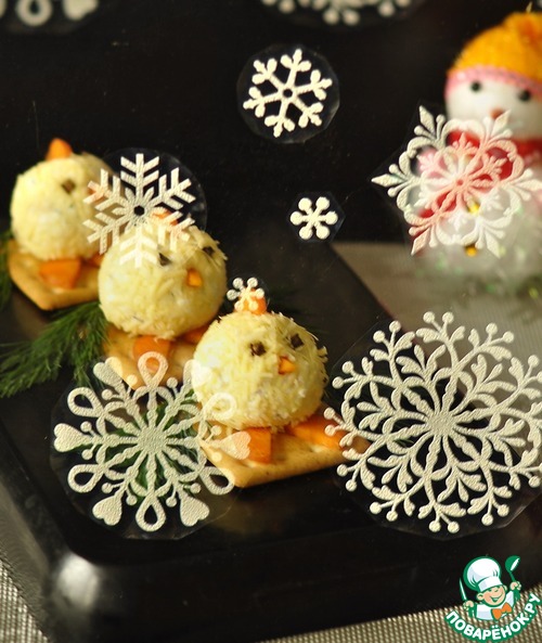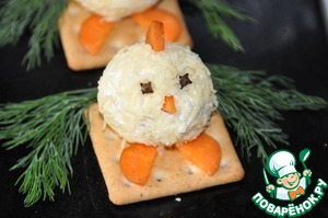 Для сервировки готовые шарики кладём на крекеры. Из указанного количества у меня получилось 6 "цыплят".