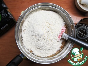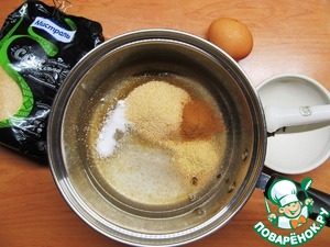Снять смесь с огня. Добавить соду и тщательно перемешать до образования пены. Затем добавить масло, размешать до растворения. И слегка взбитое яйцо.