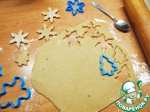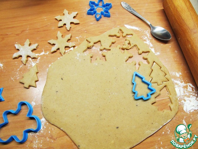 С помощью вырубок сформировать будущее печенье и выложить на противень. Поставить запекаться в заранее разогретую до 180 градусов духовку на 10-12 минут.