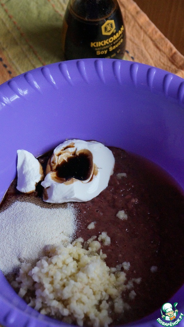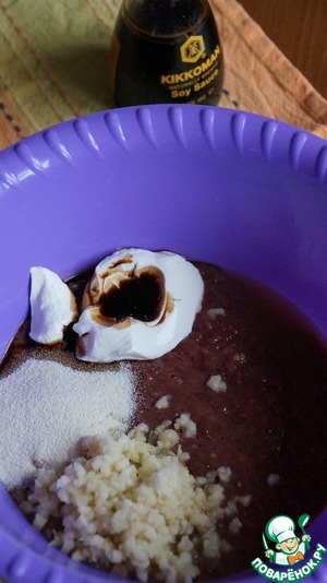 Добавляем сметану, манку и соевый соус.