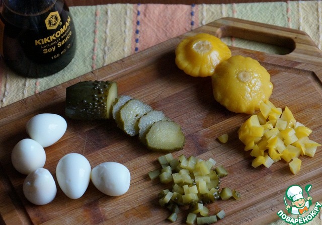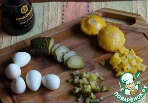 Моя душа пожелала что-то солененько, я взяла понемногу маринованных огурчиков и патиссонов- примерно 3 ст. л. с горкой смеси из нарезанных огурчиков и патиссонов..