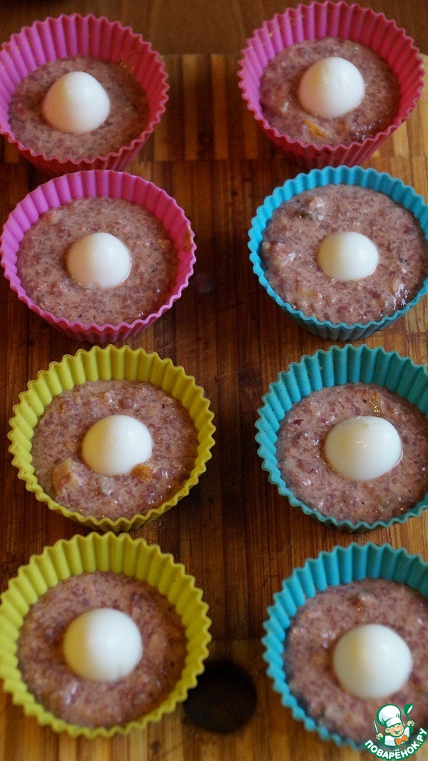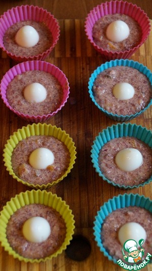 • В силиконовые формочки наливаем массу, внутрь ставим перепелиные яйца.
