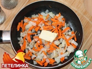 4. Приготовим грибную подливу. Нарезаем кубиками репчатый лук и выкладываем на разогретую сковороду, обжариваем до прозрачности. Затем кладем сливочное масло, порезанную соломкой морковь, пассеруем 1-2 минуты.