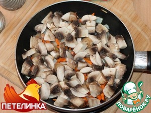 5. Нарезаем кубиками шампиньоны и добавляем в сковороду к пассеровке. Накрываем сковороду крышкой и тушим до готовности грибов, минут 10.
