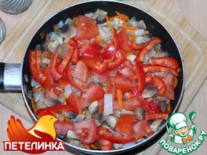 6. Затем кладем порезанный дольками помидор и порезанный соломкой сладкий перец, тушим 5 минут