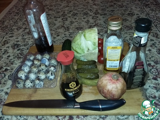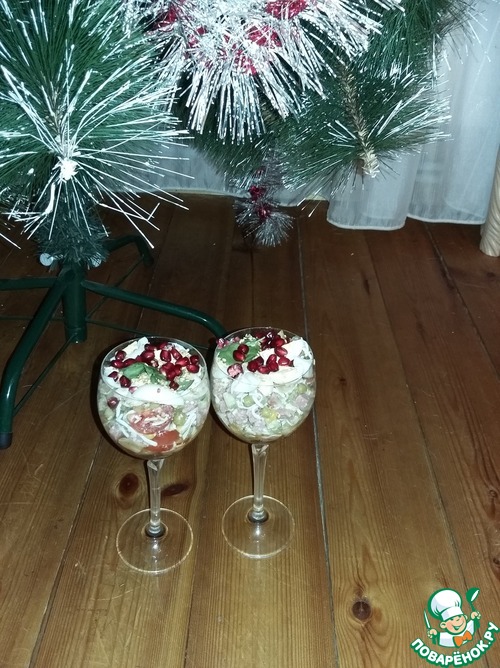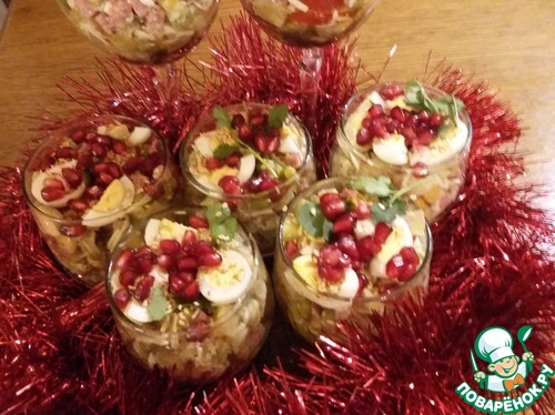 • Смешиваем нашу заправку, уксус, масло, перец, соус соевый, очищаем гранат, разбираем по зернам. Здесь кто как любит, да кстати, если гранат кисло-сладкий- получается вкуснее, чем он просто сладкий. Раскладываем все в порционные стаканы или бокалы, заливаем заправкой, сверху посыпаем кунжутом и гранатом. Хорошего НОВОГО ГОДА!!! и Приятного аппетита!!!