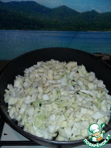 • Нарезаем капусту кубиками примерно 1,5 на 1,5 см, примерно вот так и ставим на огонь обжаривать в сковороде.
