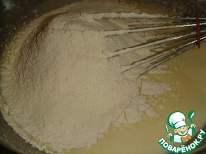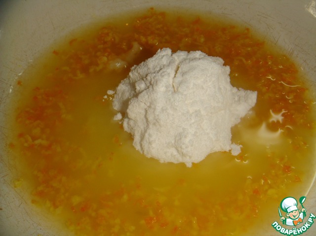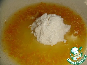 • Добавить цедру от половины апельсина и 50 г свежевыжатого апельсинового сока, перемешать. Ввести просеянную муку, разрыхлитель.