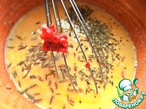 Переходим к яичному рулету. Вбить в молоко яйца, добавить томатную пасту, тмин, травы.