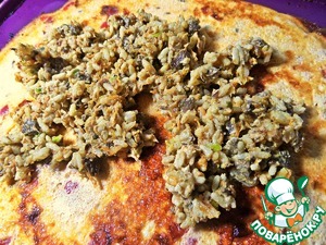 Наносим печёночно-рисовую начинку на яичный пласт.