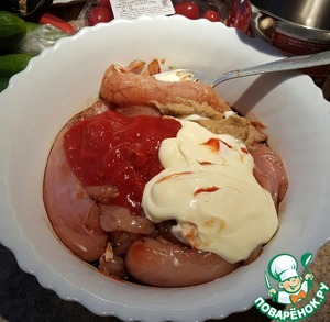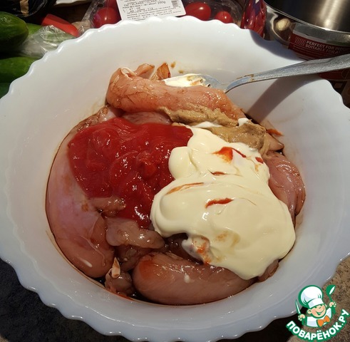 • Филе заливаем соевым соусом. Перемешиваем. Добавляем горчицу, кетчуп, майонез.