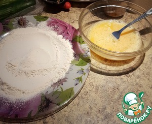 • Яйца, соль смешиваем с водой. Подготавливаем муку.