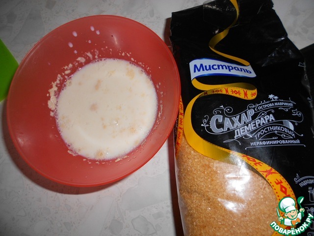 - Сахар тростниковый (Демерара от Мистраль :25 г в опару,остальное- для присыпки булочек) — 65 г