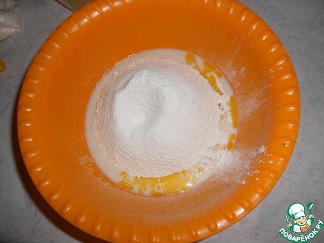 В теплом молоке растворить дрожжи, добавить сахар и оставить в теплом месте на 15 мин. до появления пенной шапочки.