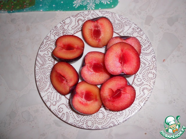 Выложить в углубление половинки слив, срезом вниз, вдавив их в тесто. Дать постоять в теплом месте 30 мин.