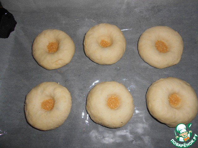 Тесто разделить на 6 частей, сформовать круглые булочки, оставить в теплом месте на 20 мин, затем скалкой сделать углубления, присыпать каждое углубление небольшим количеством тростникового сахара.
