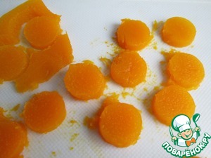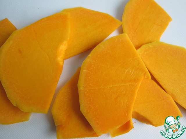 Вскипятим воду с 3 ст. л. сахара. Опустить в неё тыкву и варить 5 минут. Затем тыквенные пластины откинуть на дуршлаг и остудить.