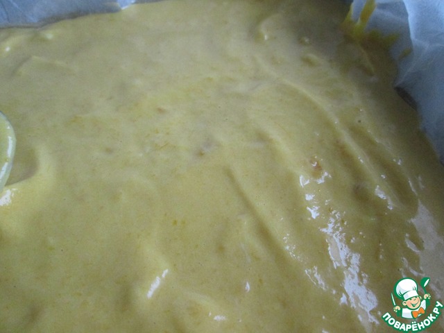 Форму смазать маслом, вылить тесто и разровнять. Для лучшего извлечения коржа из формы я простелила её бумагой для выпечки, смазанной маслом. Духовку разогреть до 170 градусов. Выпекать 40 минут. Корж охладить в форме. Моя форма размером 19*19 см