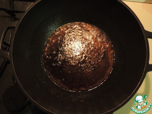 Лучше использовать Вок, или сковороду с толстым дном, но если нет таковой подойдёт и обычная сковорода. В моем случае что-то вроде казанка чугунного. Наливаем 3 столовые ложки растительного масла, я использовала смесь, растительного и оливкового, ставим на средний огонь, добавляем 2 столовые ложки мёда (не бросайтесь тапками, можно добавить сахар, инвертный сироп и т. п., каждому своё, в моём случае мёд). Доводим до кипения.