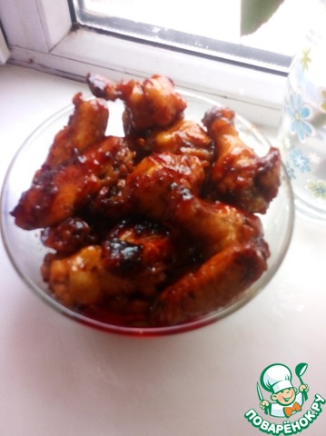 По мере выпаривания соуса (точнее он не выпаривается, а густеет и глазирует крылышки) можно снизить огонь до ниже среднего, чтобы они равномерно прожарились. Выкладываем готовые крылышки и поливаем оставшимся в сковороде соусом.