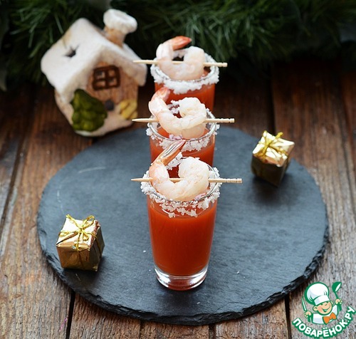 Очень красивая и интересная закуска отлично подойдет к крепким спиртным напиткам, особенно к водке. Представляет собой что-то вроде овощного сока в маленькой рюмочке и креветки на шпажке. Удивите своих гостей этим интересным сочетанием!