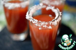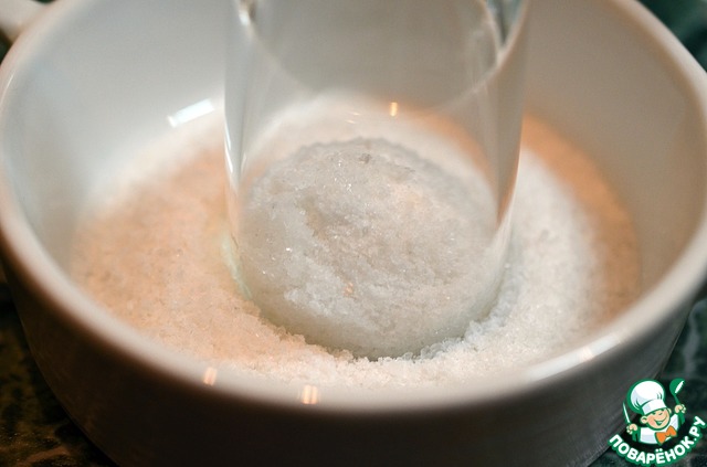 Рюмки или шоты, в которых будете подавать закуску, окунуть сначала в воду, затем в соль, чтобы образовалась белая окантовка по краю.