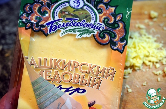 • Сыр натереть. Я использую Башкирский медовый сыр Белебеевского молочного комбината. Он полностью натурален, не содержит растительного и пальмового масла и обладает высокими вкусовыми качествами.
