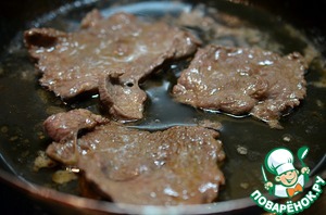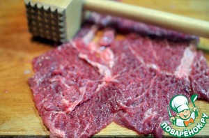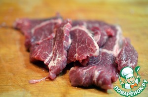 Говядину нарезать тонкими ломтиками.