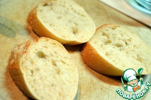 Пока мясо маринуется, нарежем багет. Кусочки должны быть ровными, чтобы потом, когда Вы положите сырое яйцо, желток не скатывался.