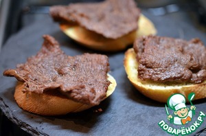 На кусочки багета выложить ломтики мяса.