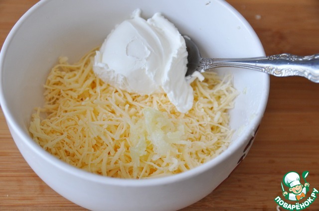 К тёртому сыру добавляем творожный сыр и натёртый чеснок (или выдавленный).