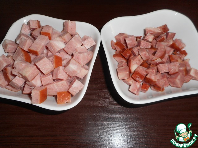 Колбасу, режем кубиками (я использовала - копчённую колбасу, ветчину куриную)