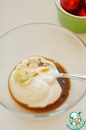 Для соуса смешайте сметану, майонез, чеснок и соевый соус