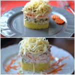 Укладывайте салат слоями: картофель, огурец, морковь. Смазывайте каждый слой соусом, и при желании каждый слой можно подсолить