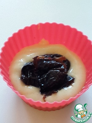 В формочки выложите половину теста, затем ягодку чернослива и остальное тесто. -